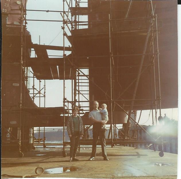 Klara og Ole med mellomste sønn Bernt på armen foran roret på Rimfonn